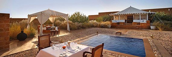 A luxury desert camp and spa, The Serai has 21, large canvas tents set on thirty acres of a hundred acre estate of indigenous desert scrub in the Great Thar Desert. The camp has a pool inspired by a traditional Indian step-well, a Spa created by Raison d’Etre, one of the leading Spa companies in the world, a Dining Tent and Lounge Bar. The Relais & Châteaux signature reflects this ambition: “ALL AROUND THE WORLD, UNIQUE IN THE WORLD.“ Relais & Châteaux is also a family of hoteliers and Grands Chefs from all over the world who share a passion for and a personal commitment to ensuring their guests are privy to moments of exceptional harmony. To choose Relais & Châteaux is to experience an unforgettable celebration of the senses. There are three types of Suites at The Serai. The Tented Suites of which there are fourteen, are pitched on a base of beautiful local ‘Jaisalmer’ stone. Each comprise of an exterior relaxing area, a covered sitting room, a spacious bedroom and en suite bathroom, covering an area of over a thousand square feet. The Luxury Tented Suites have in addition, a private walled-in garden with a sunken pool. The Royal Suite boasts its own private spa, outdoor pool and dining and lounge tents. Hotel Category: Luxury Heritage