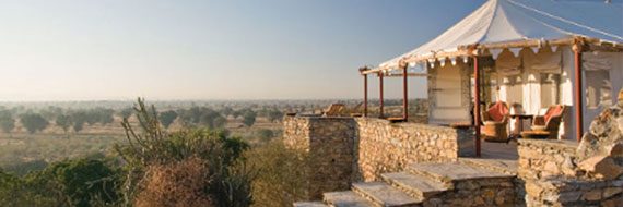 uxury tents have always been an important part of Rajput lifestyle. Constant campaigns in far flung lands meant long stays in tents under inhospitable conditions. Tents were the only luxury available and soon these “homes away from home” evolved into mobile, mini-palaces. Chhatra Sagar captures the essence of this romance. All tents face east overlooking the lake and have private sit outs offering panoramic views. Each tent is carefully hand stitched with interiors block printed in traditional floral motifs. They are spacious, comfortably furnished with locally crafted furniture, and have well appointed private facilities. Two of the tents are set atop a hill providing complete privacy and a breathtaking 360 degree view. The camp has 11 guest tents on the dam and two on the hill. The descendants of the people invited here by Thakur Chhatra Singh still live in settlements around Chhatra Sagar. Predominantly farmers and shepherds, they live a self-contained and harmonious life which has changed little in the last century. Chhatra Sagar continues to recharge their wells and provide water for their livestock. The camp organises farm & village visits and conducts bird watching tours. Hotel Category: Luxury Heritage